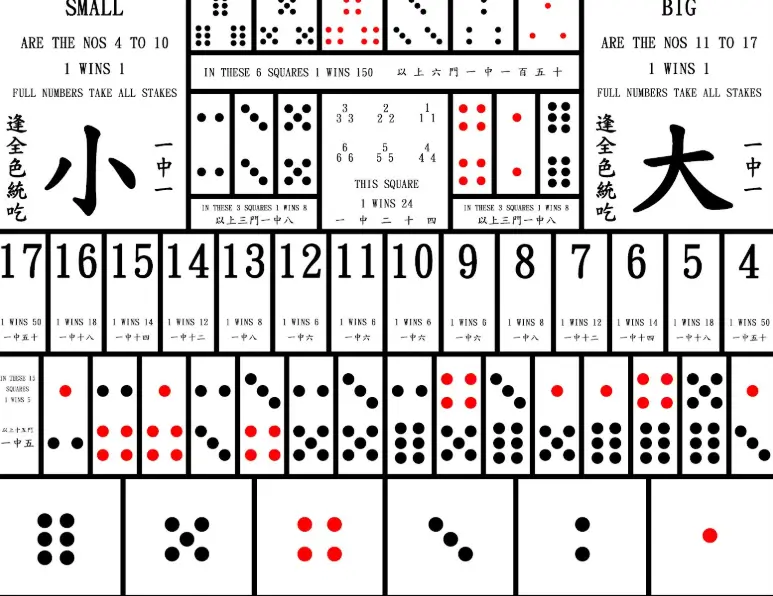 总和玩法:猜点数总和是“小”(4–10)还是“大”(11–17)。