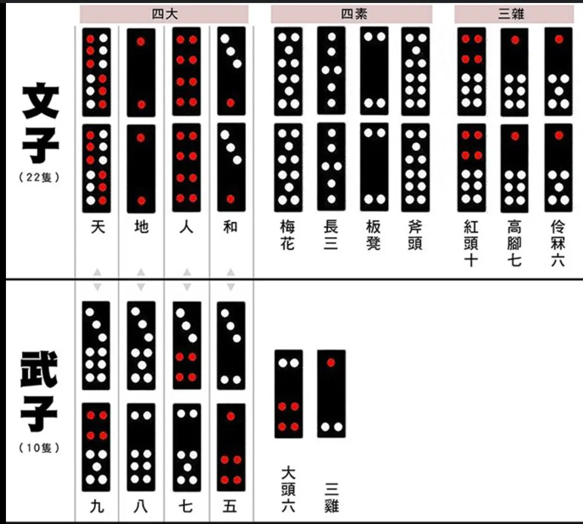 整副骨牌共有三十二张,分为两大阵营——“文”与“武”。